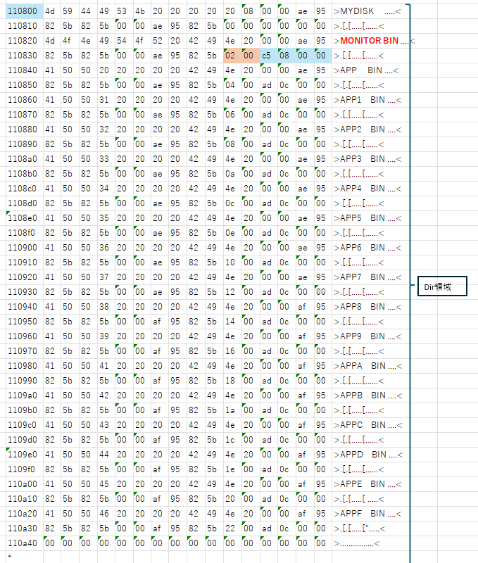 ルートディレクトリの管理領域は0x110800Byteから始まります。数字の羅列でなにがなにやらなんですが、その右側にあるASCII表示を見ると、『MONITOR BIN』『APP BIN』『APP1 BIN』……とどこかで見たような名前があります。そうファイル名です。ディレクトリエントリは1エントリ=32Byteでファイル名、属性、開始クラスタ番号、サイズ等を持っています。最大エントリ数であるROOT_ENT_CNT(0x0200)個並んでいる中から、お目当てのファイル名を探し出して開始クラスタ番号、サイズを取り出し使用するわけです。