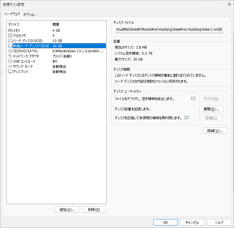 そんなわけで、インストールとは直接関係ないんですが、ディスク容量を増やしてみようと思います。