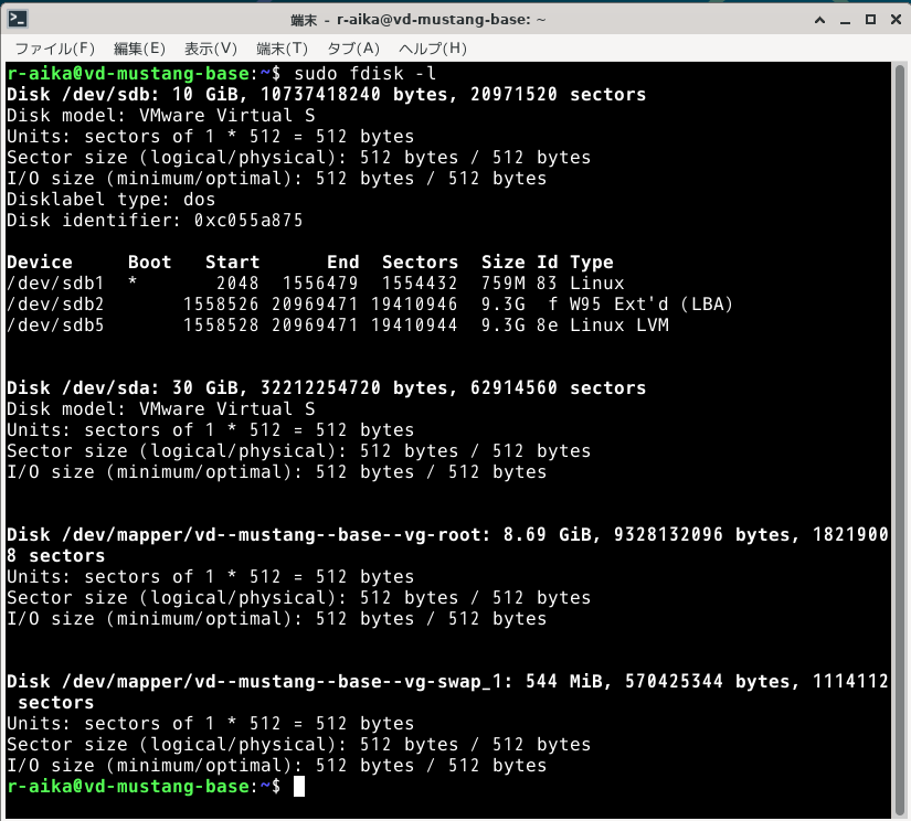 もともと存在した10GB(/dev/sdb)の他に30GB(/dev/sda)のディスクがマウントされずに存在することがわかります。