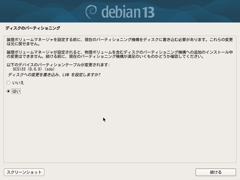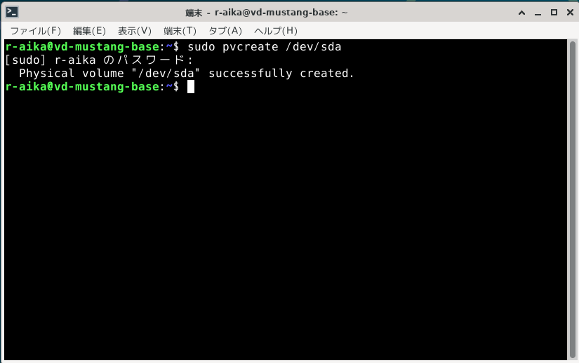 追加した/dev/sdaを全て使って物理ボリューム(Physical Volume)を作成します。