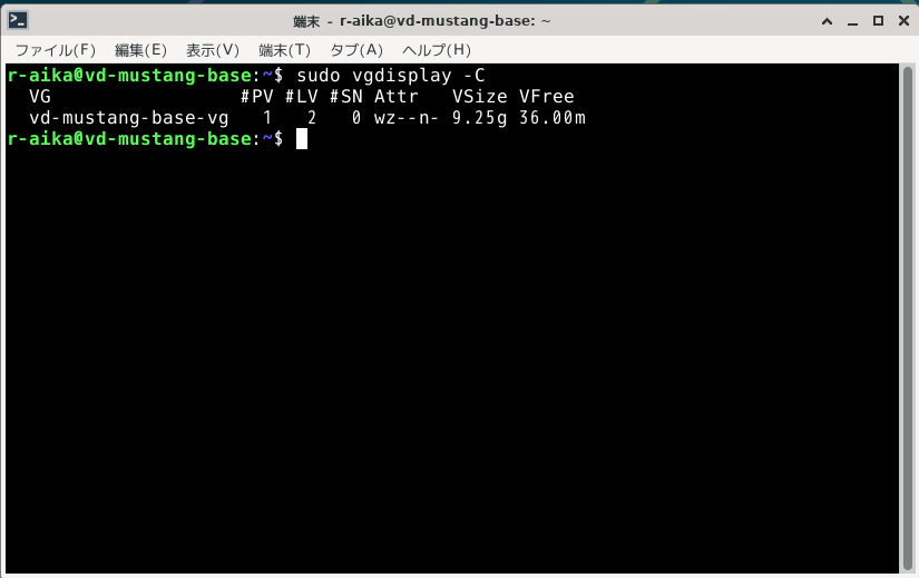 現在のボリュームグループ(volume group)の状況を確認します。