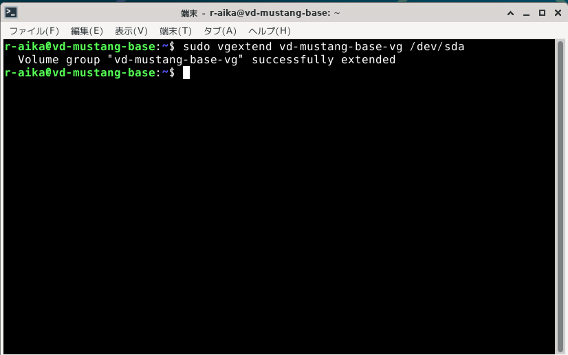 作成した物理ボリュームの/dev/sdaをrootボリュームのボリュームグループ(Volume Group)に追加します。これで/dev/sdaの領域が論理ボリュームから使えるようになるはずです。