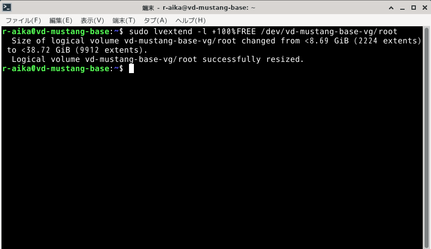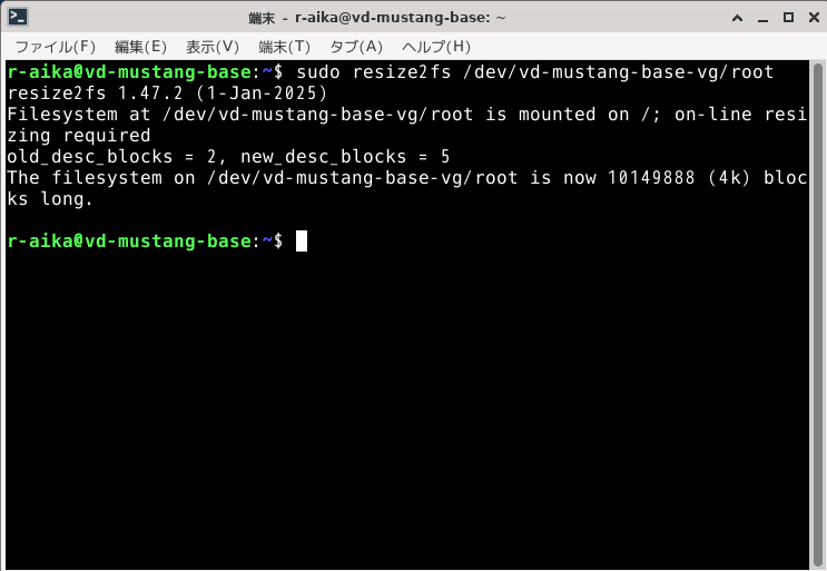 ディスクの容量は増えましたが、ファイルシステムは変わってません。なので最後にファイルシステムをディスクいっぱい使うように拡張します。