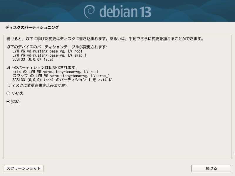 論理ボリュームを見てみるとボリュームグループ内にrootとswap_1があるらしいです。容量を増やしたいのは当然rootですね。