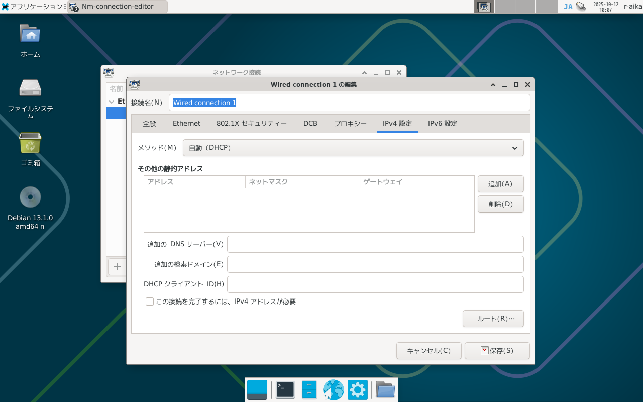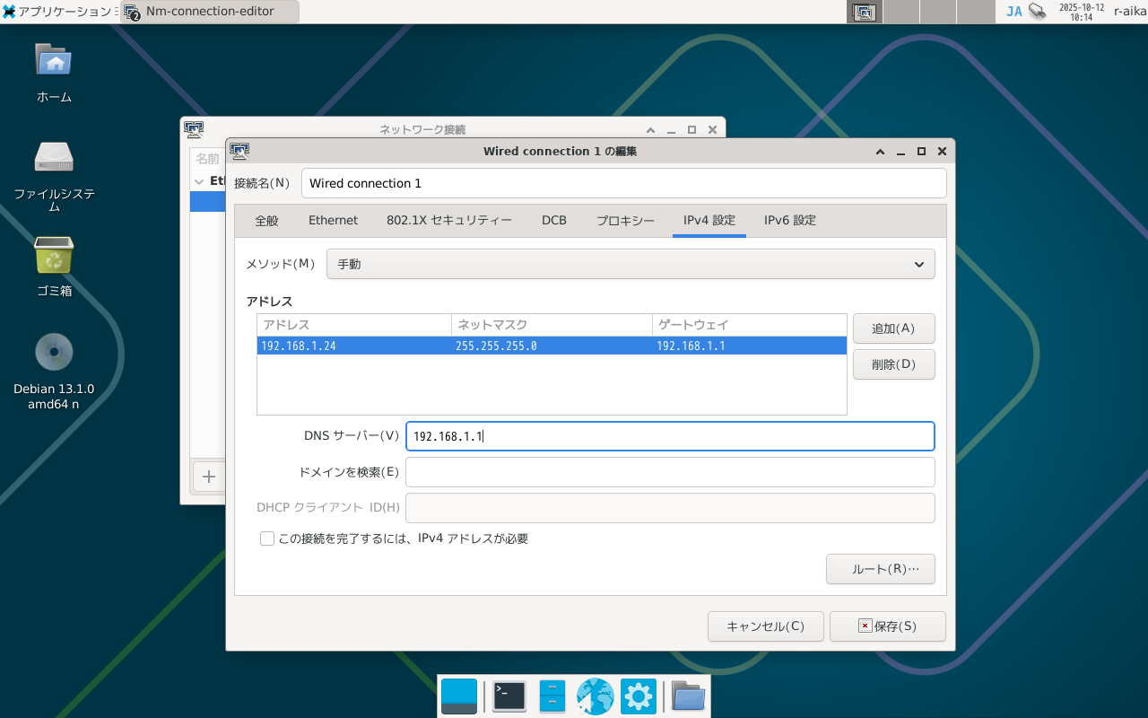 クライアントとしてのみ使うのであればDHCPでIPアドレスを配布してもらったほうが楽なんですが、リモートデスクトップとかSSHとかで外から接続する場合があるので固定IPは必須だったりします。