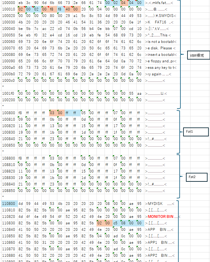 VBR領域の後、FAT1、FAT2の領域があって、その後ろにDIR領域があります。『MONITOR .BIN』はDIR領域の2番目のエントリにあって、開始クラスタは0x0002、サイズは0x000008c5となっています。(注:リトルエンディアン)