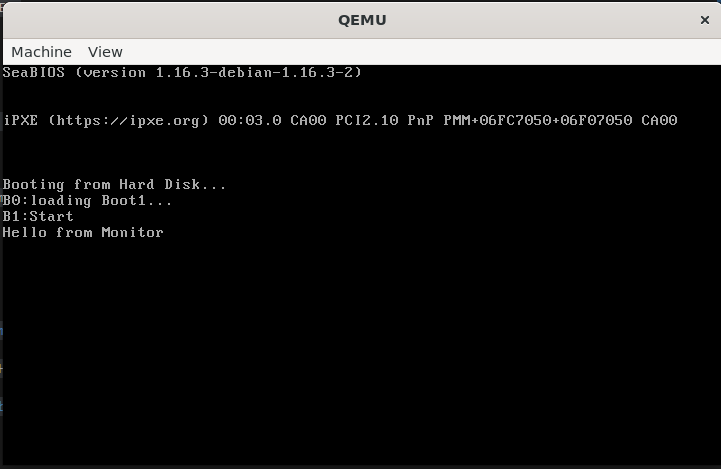 Hello from Monitorが表示されてますね。正しく読み込まれて遷移されたことがわかります。これで一つのゴールが明確になりました。monitorを読み込んで遷移する。このゴールを崩さないように、ディレクトリエントリの検索、fatチェーンの追跡を行うことになります。
