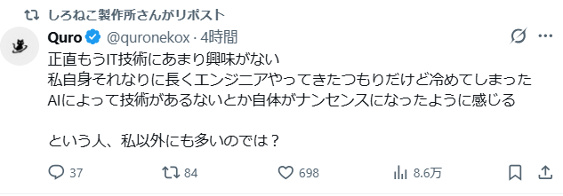 投稿者は「IT技術にあまり興味がなくなった。長くエンジニアをやってきたつもりだけど冷めてしまった。AIによって技術がある/ないとか自体がナンセンスになったように感じる」と述べています。