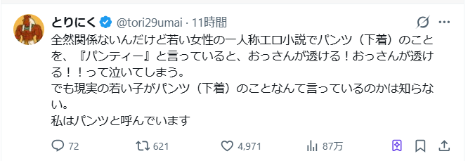• 読者の脳内:「あ、これ書いてるの、若い女の子じゃなくて『女の子はパンティーって言うはずだ』と思い込んでるおじさんだな……」 これが「おっさんが透ける」という表現の正体です。